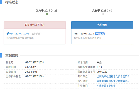 近日,國標委發(fā)布公告,由江蘇上上電纜集團有限公司、中國核電工程有限公司、生態(tài)環(huán)境部核與輻射安全中心、深圳中廣核工程設計有限公司、上海電纜研究所有限公司、上海核工程研究設計院股份有限公司、清華大學等核電監(jiān)管機構、核電纜生產企業(yè)、核電設計院、核電運行單位共同制定的GB/T 22577—2025《核電站用1E級電纜 通用要求》國家標準于2025年8月29日正式發(fā)布,將于2026年3月1日實施。